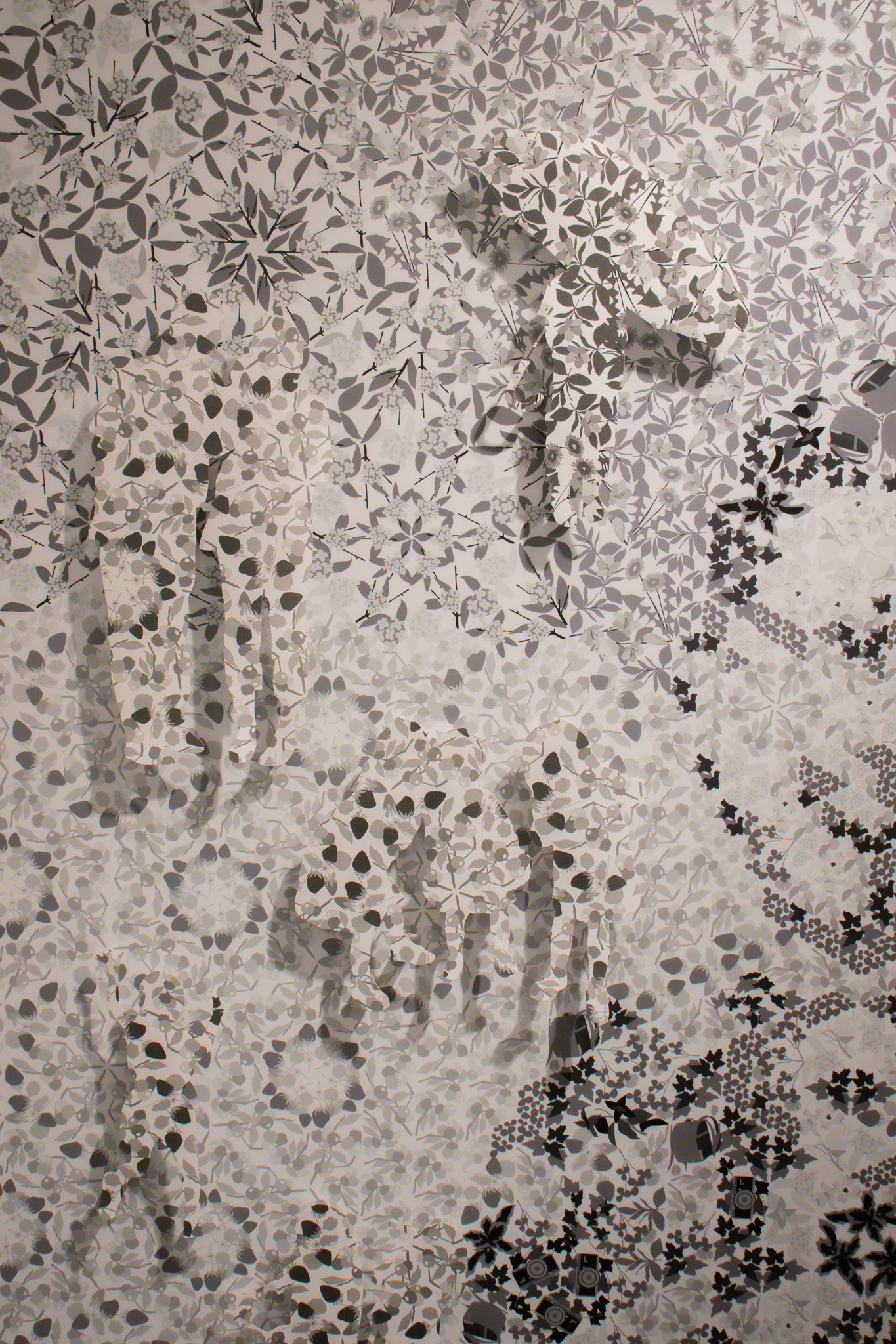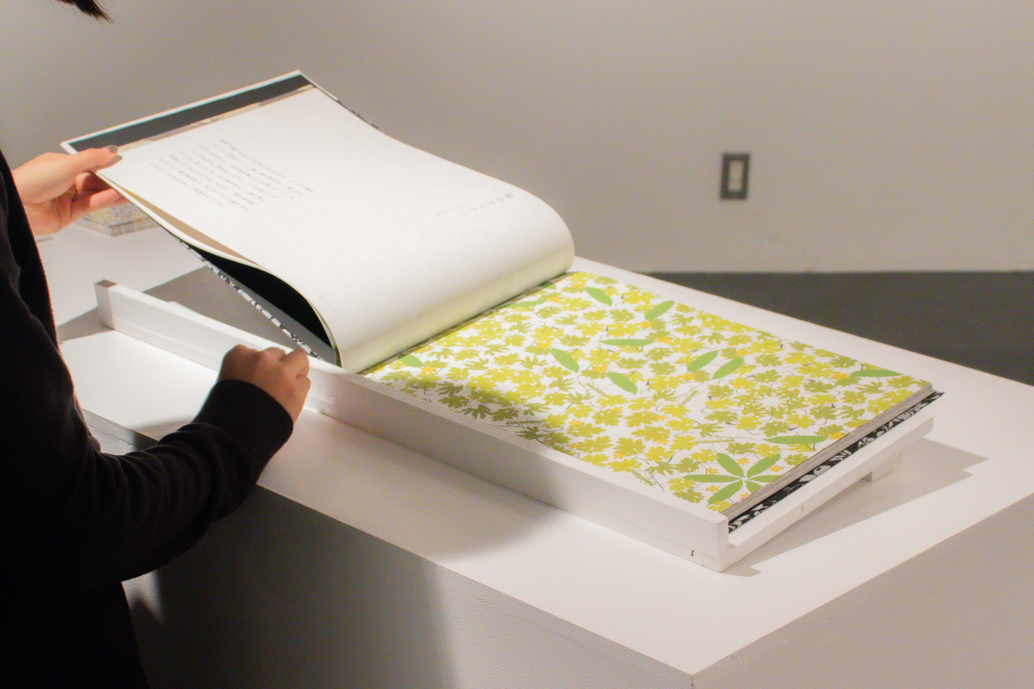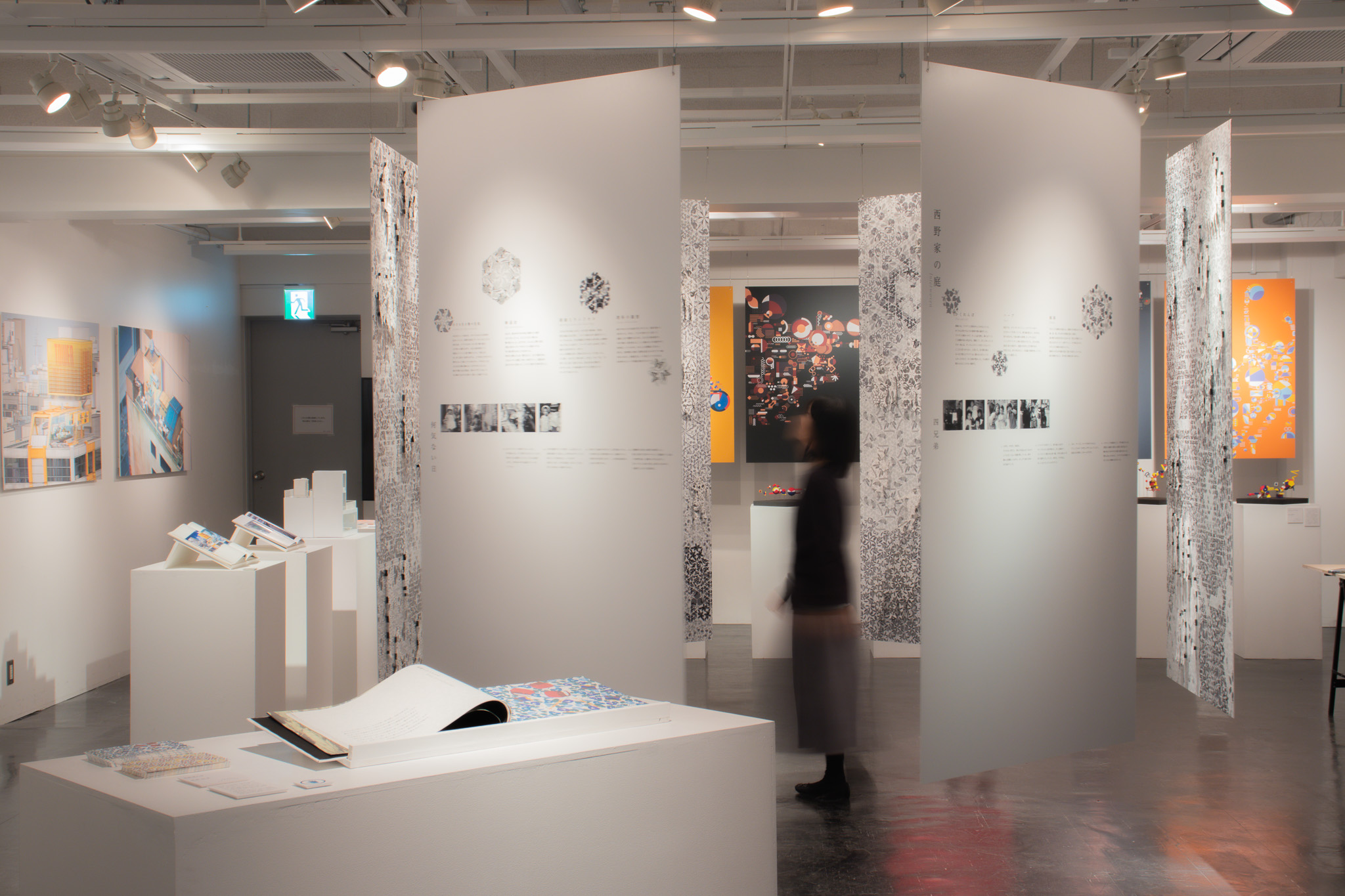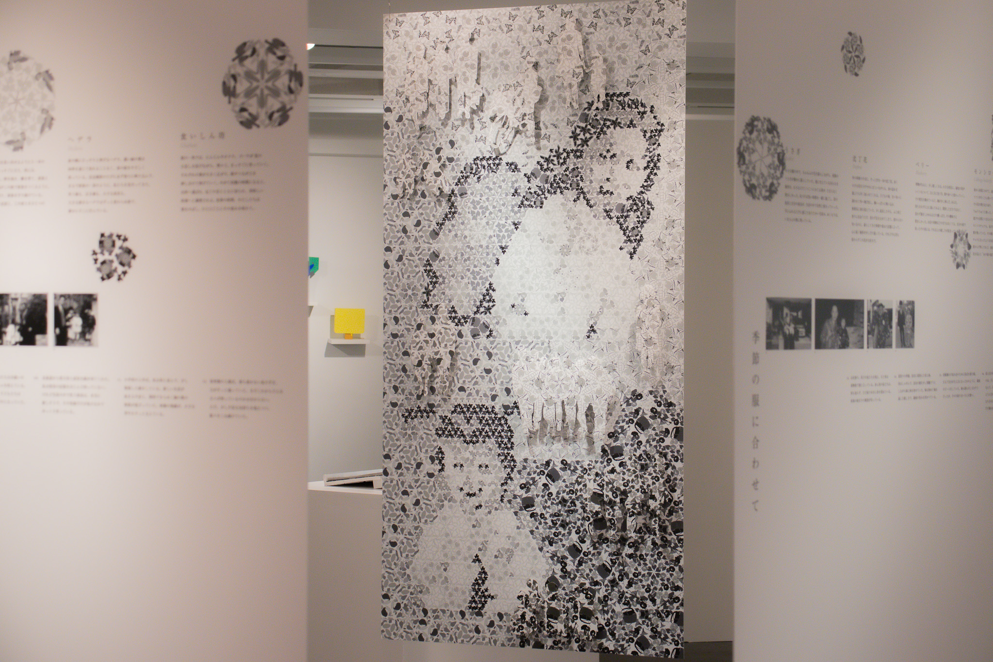 展示は空間と本の二つの方法で設計しました。空間は6枚の大型パネルにより、鑑賞者が模様の中に包み込まれるように構成されています。家族写真を同化させる表現と、家族のシルエットで切り抜く表現で、両者の間に生まれる境界の揺らぎを探っています。また、白黒にすることで、記憶の中で形成される関係を可視化しました。一方、本では模様に色彩を用いて表現し、庭の物語や日々の写真を収めることで、季節ごとの変化や思い出を追体験できるようにしました。記憶・視覚・物質性の差異が際立つように設計しました。